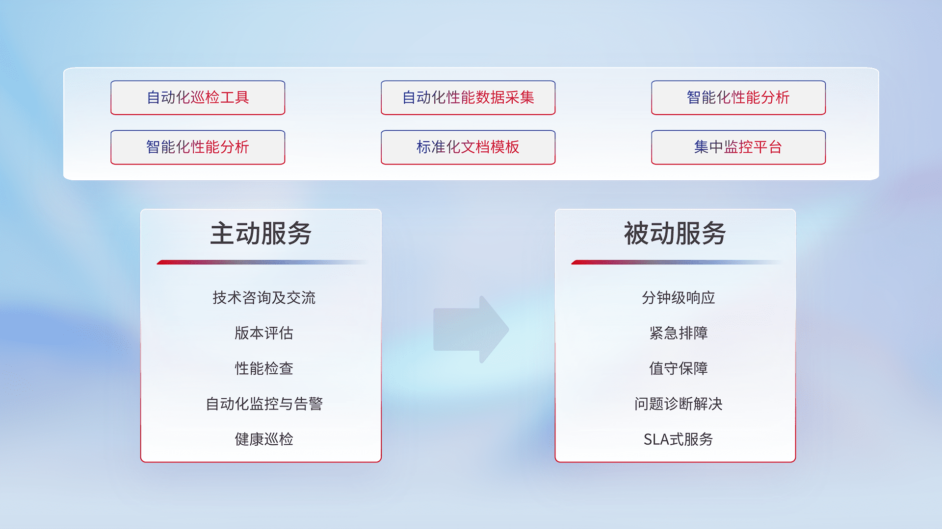 智能化工具和标准化文档,,,,保障服务质量,,,,提供主动服务(包含技术咨询、、、、版本评估、、性能检查、、自动化监控与告警、、、健康巡检)和被动服务包含(分钟级响应、、紧急排障、、、、值守保障、、、问题诊断解决、、、SLA服务)。。。